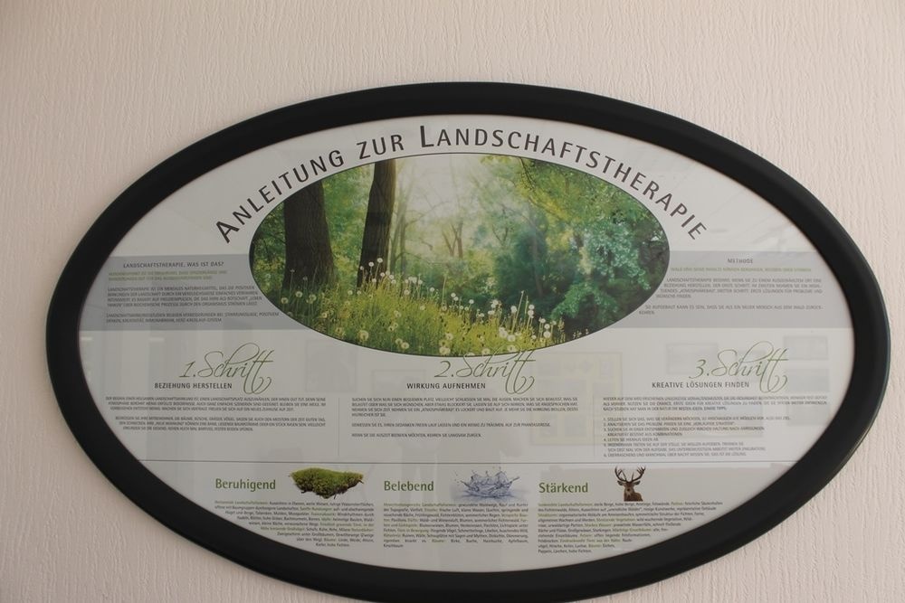 Der Fußboden und die roten Pfeile an der Wand weisen den Weg in die obere Etage, wo ein Ausstellungsraum entstanden ist. In dem lichtdurchfluteten Raum werden die Wechselbeziehungen zwischen Bewegung, Gesundheit und Wald unter Einbeziehung des Themas „Kneipp“ dargestellt. Neben den fünf Säulen der Gesundheit nach Sebastian Kneipp und seiner Ordnungstherapie kann man auf einer gemütlichen Sitzgelegenheit die Bildwand - mit musikalischer Untermalung - auf sich einwirken lassen. Zu bewundern sind beruhigende, belebende und verstärkende Motive - alles Bilder aus der Region