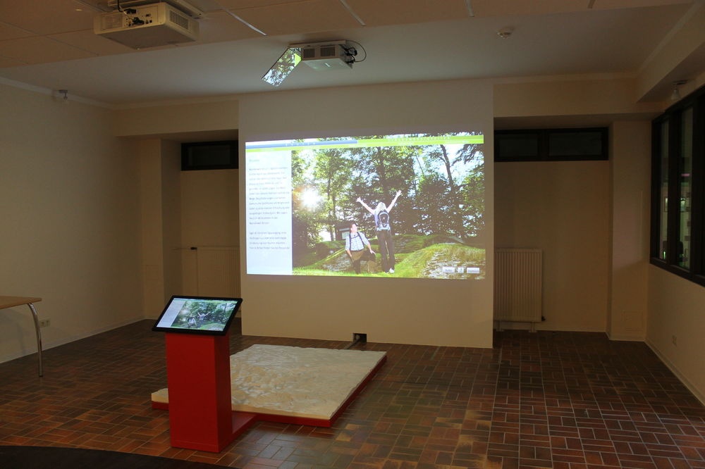 Der untere Kommunikationsraum - die rote Leitfarbe kennzeichnet schon von außen den Eingangsbereich - hat unmittelbaren Zugang zum Kurpark und zur Terrasse des Hotels am Kurpark. Hier kann man bei gutem Wetter gemütlich Kaffee trinken. Im Raum selbst gibt es jede Menge Informationen und Kartenmaterial an der Wand. Folgt man der besonderen Wegführung im Fußboden, gelangt man in einen Informationsflur, der das so genannte „Interaktive Landschaftsmodell“ beherbergt. Dieses Modell vermittelt den Besuchern per Computersteuerung anschauliche Informationen über Wanderwege, Attraktionen, Gastronomie, Landschaftsstruktur und Geschichte in Brilon. Aber auch Sehenswürdigkeiten in Olsberg und Willingen sind miteinbezogen.