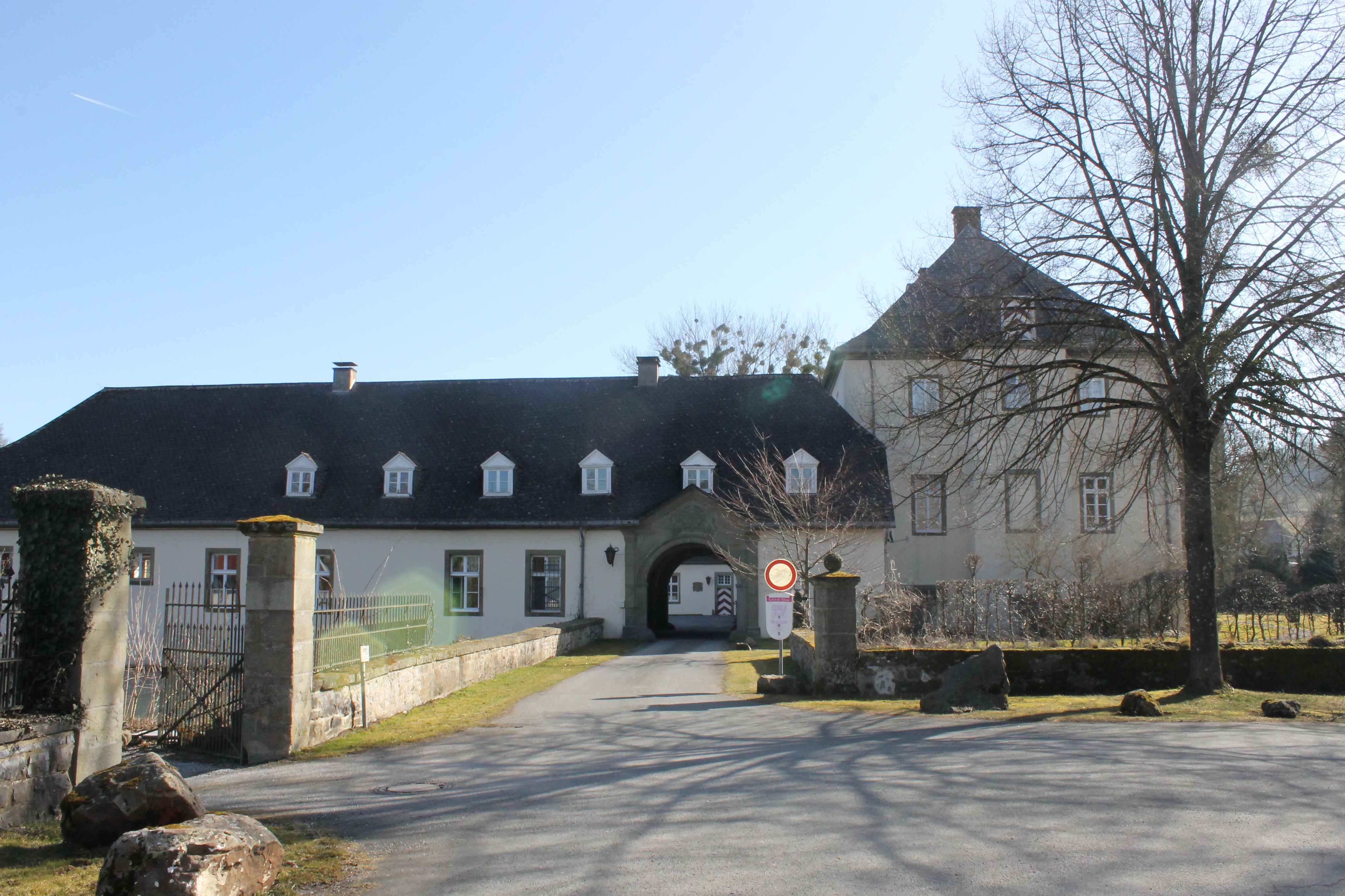 Eine Besichtigung des Schlosses ist nicht möglich, wohl aber eine Betrachtung der Anlage von der Straße und dem Dornröschenweg aus.