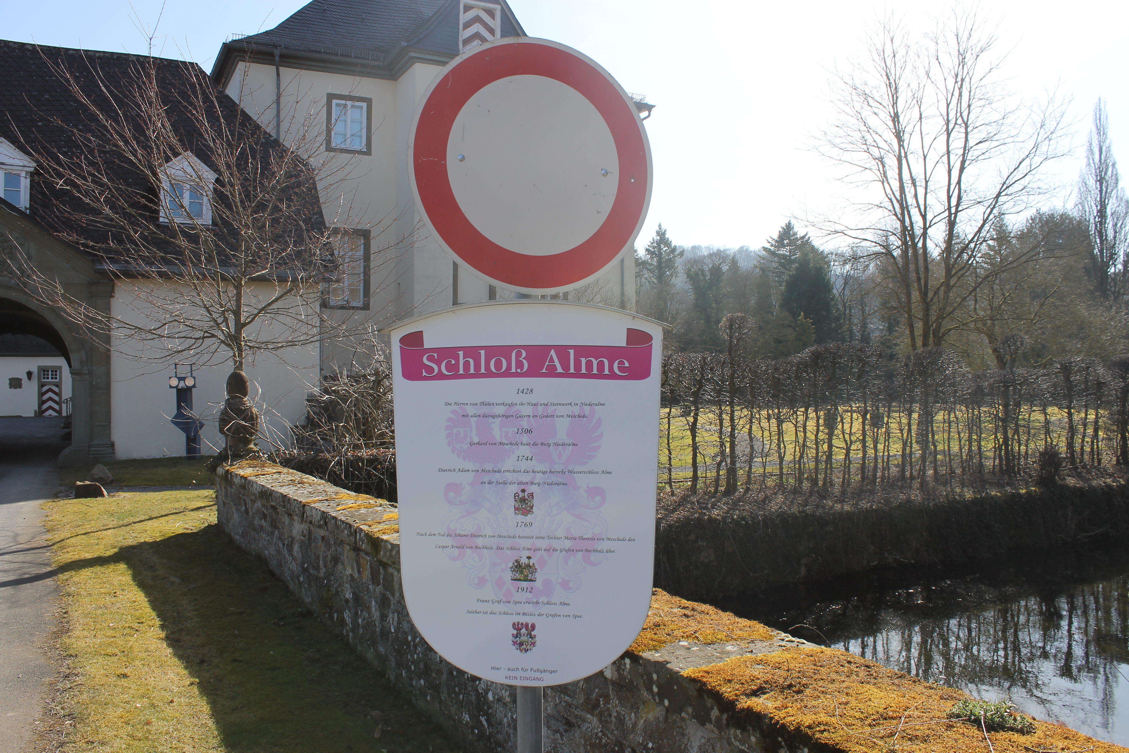 Dornröschenweg –Wasserschloss Alme – Lambachpumpe. Ein Teil des Wanderweges Al2 führt vom Entenstall am Mühlengraben entlang zum gemütlichen Restaurant „Almer Schlossmühle“ von dort an der Schlossmauer entlang zum romantischen Dornröschenweg am Schlossteich entlang mit Blick auf den Innenhof des Almer Wasserschlosses aus der 1. Hälfte des 18. Jh.(Eine Besichtigung ist nicht möglich).