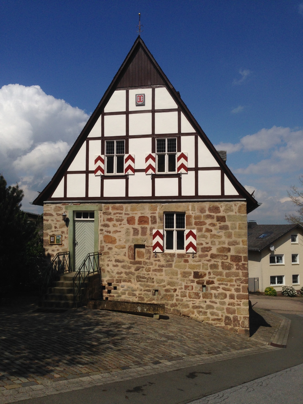 Nach ca. 200 m erwartet uns bereits auf der linken Seite die erste Sehenswürdigkeit: das im 15. Jh. im spätgotischen Stil erbaute ehem. Rathaus - eines der ältesten in Westfalen - bildete bis 1809 (Aufhebung der Privilegien) den Mittelpunkt städtischen Lebens in Kallenhardt. Für Bürgermeister, Magistrat und Gerichtsbarkeiten war es bis dahin über viele Jahrhunderte die Wirkungsstätte für ihre hoheitlichen und repräsentativen Tätigkeiten.