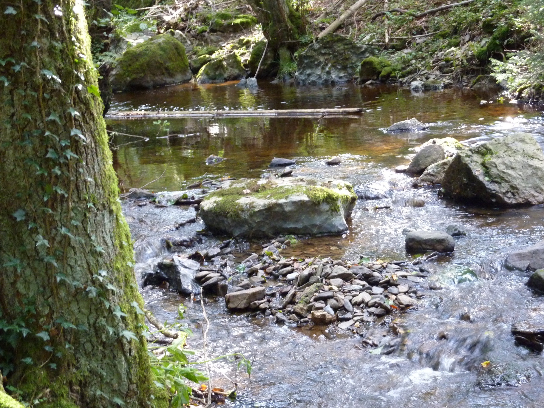 Wir folgen weiter dem Weganstieg, bis wir zu einer Schutzhütte kommen, wo wir uns für die gelsitete Anstrengung mit einer kurzen Rast belohnen können. Gemäß den weiteren Wegweistern sehen wir dann bald unterhalb des Tales einen in der Fläche sich schlängelnden, von Roterlen bestandenen Bachlauf.