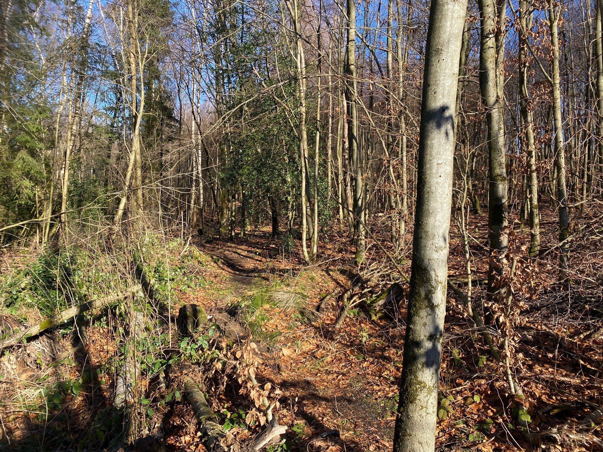 Wir entscheiden uns für links (Runde B) und folgen einem Trail in den Wald hinein. Recht bald wird der Trail zu einem Downhill Trail, welcher zu einer Lichtung führt. Ab hier geht der Trail einen gewundenen Pfad zwischen vielen Totholzablagestellen entlang den Berg herunter, bis man unten auf einem geschotterten Waldwirtschaftsweg in der Romecke ankommt.