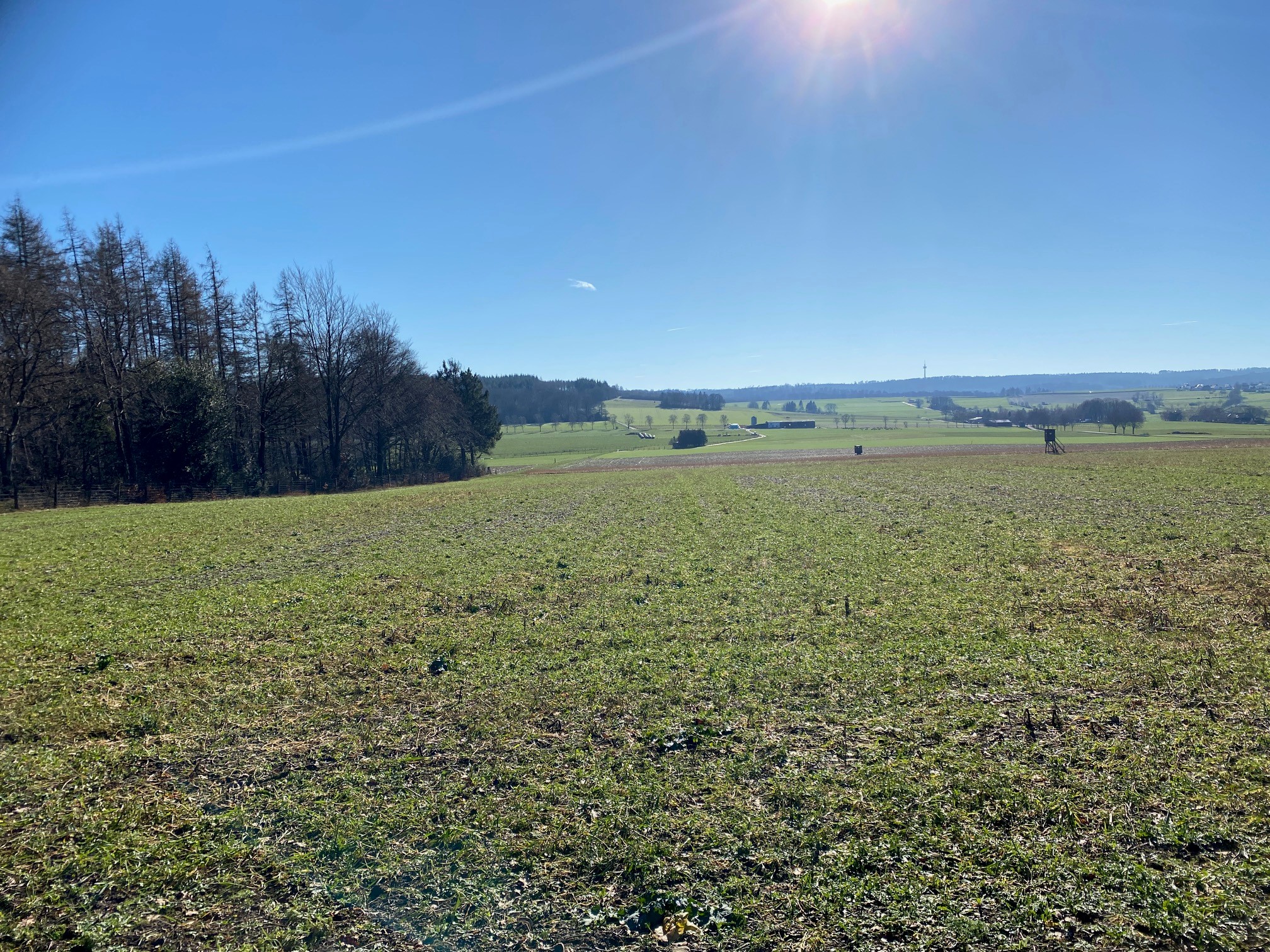 Nach der Rast geht es weiter. Wir fahren ab „Kroneneiche“ den Waldwirtschaftsweg bergrunter bis wir an einer Gabelung ankommen. Hier biegen wir links ab und folgen dem Weg am Rande des Waldes entlang, bis der Wald an der rechten Seite endet. Hier biegen wir dann rechts ab und fahren zwischen Wiese und Wald den Berg hoch, bis wir an einem Fotopoint (Holzrahmen mit Blick auf Alt-Warstein, Standort Dahlborn/Risnei) ankommen.