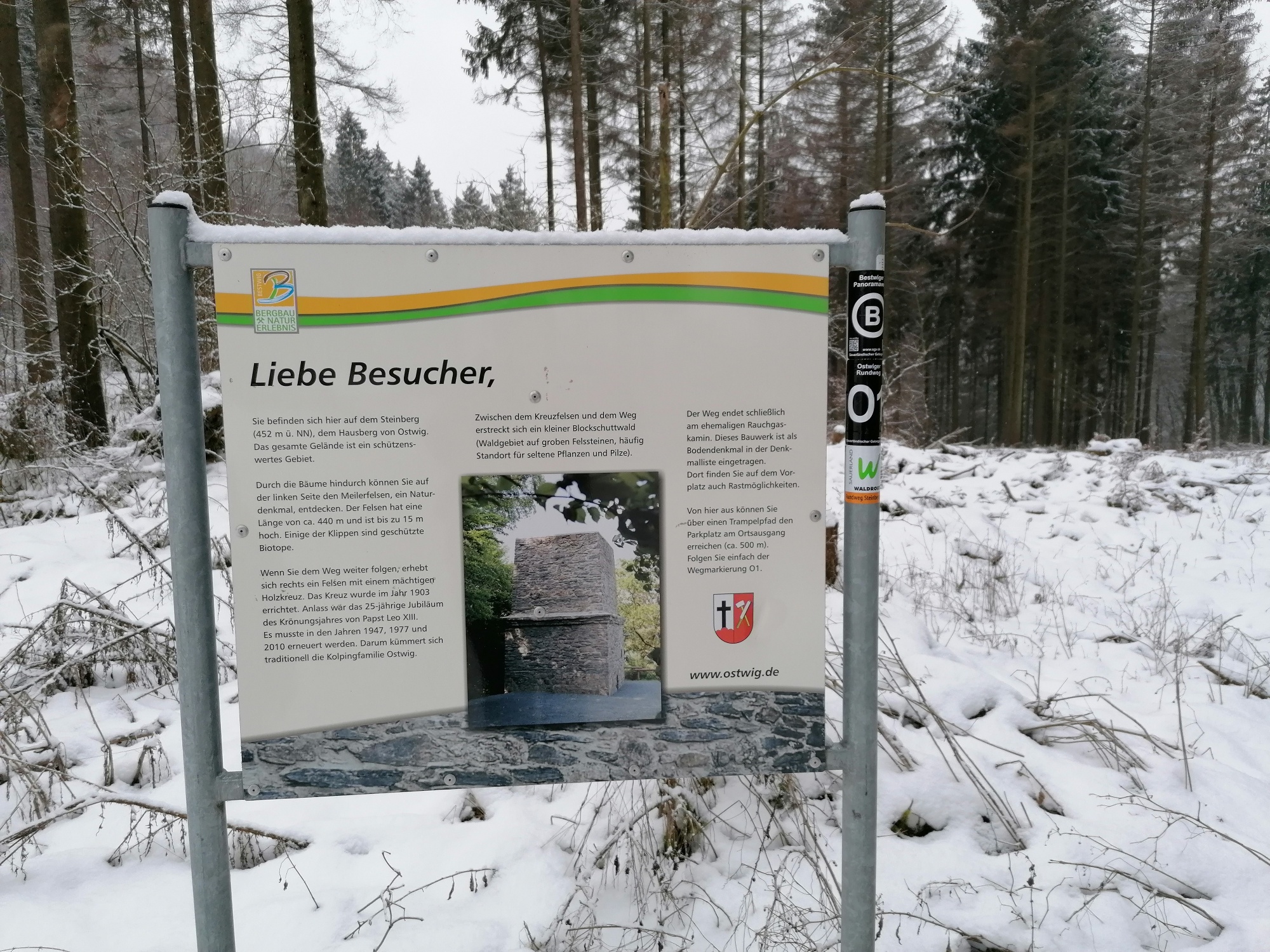 Aus der Ortsmitte Nuttlar geht es ein Stück über den Rad- und Fußweg an der Bahn entlang in Richtung der Siedlung "Dümel". Am Bahnübergang "Am Dümel" treffen wir auf den mit (B) gekennzeichneten Bestwiger Panoramaweg. Diesem folgend überqueren wir Gleise und B7 und folgen dem Fußweg auf der anderen Straßenseite leicht bergab. Erneut überqueren wir eine Bahnstrecke an einem Fußgängerübergang. Danacht geht es über die Ruhr und quer über den alten Fußballplatz weiter. Am Nassholzlager vorbei läuft der Weg durch ein kleines Waldstück bergauf. (Anfang 2021: Achtung Forstarbeiten). Danach geht es rechts auf dem Wirtschaftsweg in Richtung Ostwig weiter. Der Weg führt später links bergauf durch Weihnachtsbaumanbauflächen und danach wieder rechts auf einem Forstweg in Richtung Ostwig. An der nächsten Wegkreuzung biegt der Bestwiger Panoramaweg scharf nach links ab und wird jetzt vom O6 begleitet wird. Den O6 verlassen wir an der nächsten Kreuzung und biegen mit dem O1 nach rechts ab. Nach einigen Metern kommen wir an einer Infotafel zur Steinbergruine vorbei. Hier geht es rechts weiter - durch den Wald einem kleinen Pfad folgend zum Kreuz auf dem Kreuzberg. Schließlich folgen wir dem Pfad weiter bis zum Ziel - der Steinbergruine. Man kann die Ruine besteigen und die Aussicht über das Ruhrtal genießen. Eine Sitzecke vor der Steinbergruine lädt zur Rast ein. Anschließend geht es den gleichen Weg zurück. Ab dem Bahnübergang am Dümel folgen wie dann allerdings nicht dem Radweg ins Dorf, sondern dem (B) Bestwiger Panoramaweg auf den Dümelskopf. Hier findet sich etwas versteckt die Mariengrotte, die zum kurzen Gebet einlädt. Weiter geht es dann zunächst noch dem (B) folgend und dann nach links die Königsstraße hinunter zurück zum Ausgangspunkt.